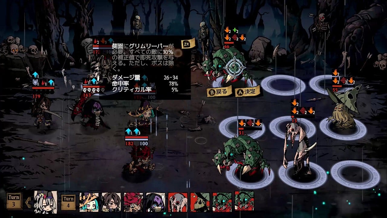 モンスターと接触すると、「コマンド選択バトル」に突入します。「スキル」を駆使して戦うか、危険を回避して逃げ出すか、状況を見極めて選択しましょう。キャラクターの位置によって、使用できる「スキル」や、「スキル」の効果範囲が異なるため、「陣形」はとても重要です。